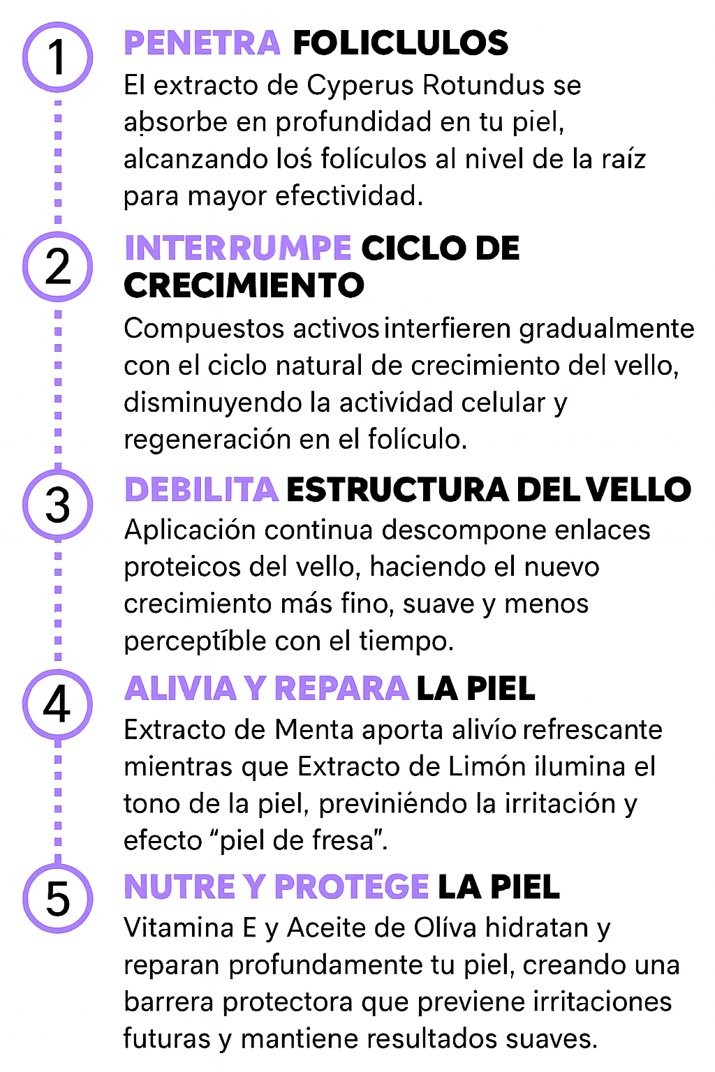 Para obtener resultados óptimos, aplicar dos veces al día (mañana y noche) sobre la piel limpia y seca. La constancia es clave para maximizar los beneficios de la reducción del vello.